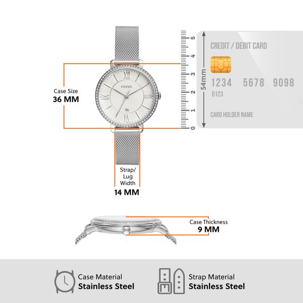 Đồng hồ Jacqueline có mặt số vân nổi màu bạc với viền đính đá lấp lánh, bộ máy ba kim có lịch ngày và dây đeo lưới bằng thép không gỉ. Tạo nên phong cách của bạn theo từng trải nghiệm khác nhau.